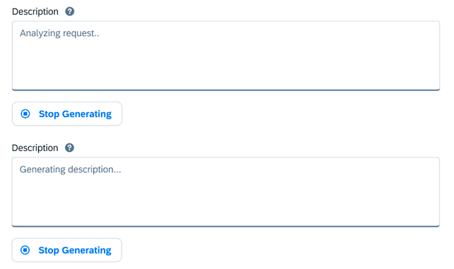 Once the user triggers the content generation, the AI progress indicator appears inside the text area or rich text editor component. Its state changes to an information value state that persists until the generation is completed or stopped by the user.